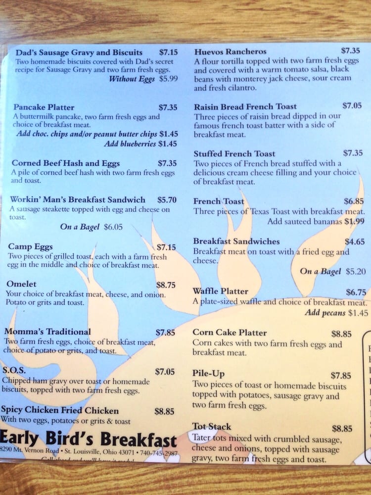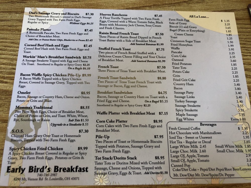 Welcome to Early Birds Breakfast, your go-to destination for delightful breakfast and brunch experiences in Saint Louisville, OH. Located at 8290 Mount Vernon Rd, this charming eatery caters to early risers and lazy brunchers alike with a menu packed with appetizing options.